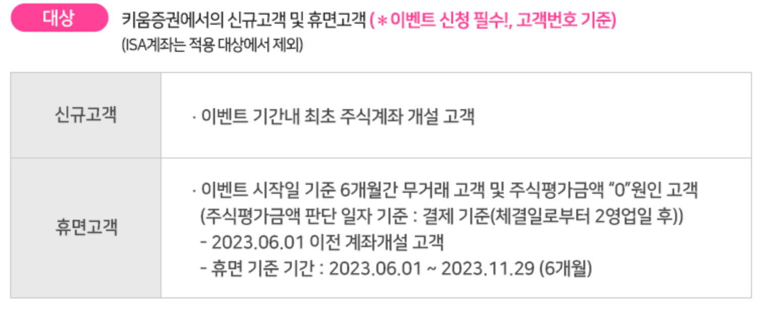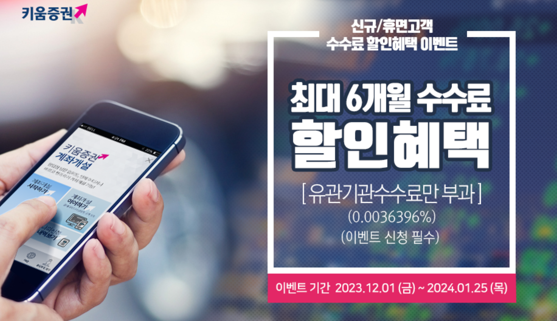 현재 키움증권에서는 신규/휴면고객을 대상으로 최대 6개월 수수료 할인을 해주는 이벤트를 진행중입니다.