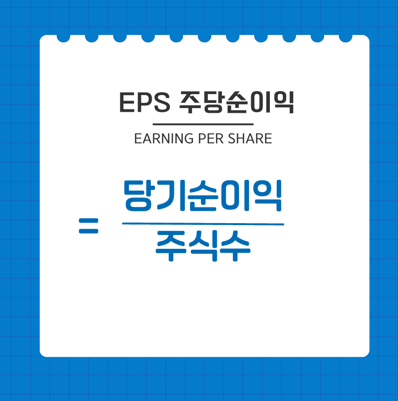 EPS(Earning per share) 는 주당순이익을 뜻합니다. 기업이 주식 1주당 벌어들이는 이익의 값을 뜻하는 것입니다. 기업이 얻은 총 수익을 발행한 주식의 수로 나누면 EPS가 나오게 됩니다. 이 값이 높을 수록 경영실적이 우수하다고 판단합니다.