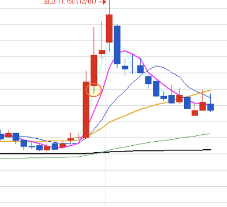 아래 차트 예시를 보면서 눌림목 매매의 매수 매도 타점을 확인해 보시면 더 이해가 빠를 거예요.