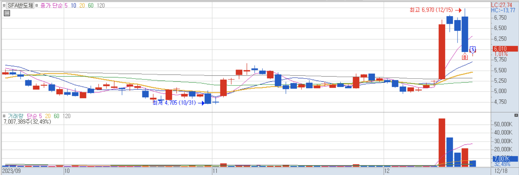 SFA반도체 일봉 오늘은 제가 했던 눌림목 실전 매매일지를 보여드렸습니다. 눌림목 매매는 비교적 안전해서 심리적으로도 흔들리지 않는 매매라고 생각합니다. 하지만 분위기가 꺽이고 있거나, 이상한 움직임이 나와주거나, 악재가 뜬다면 반드시 손절해야 합니다. -30% 금방 갈 수 있습니다. 주식은 대응입니다. 대응이 안되면 손익비가 맞지 않습니다.