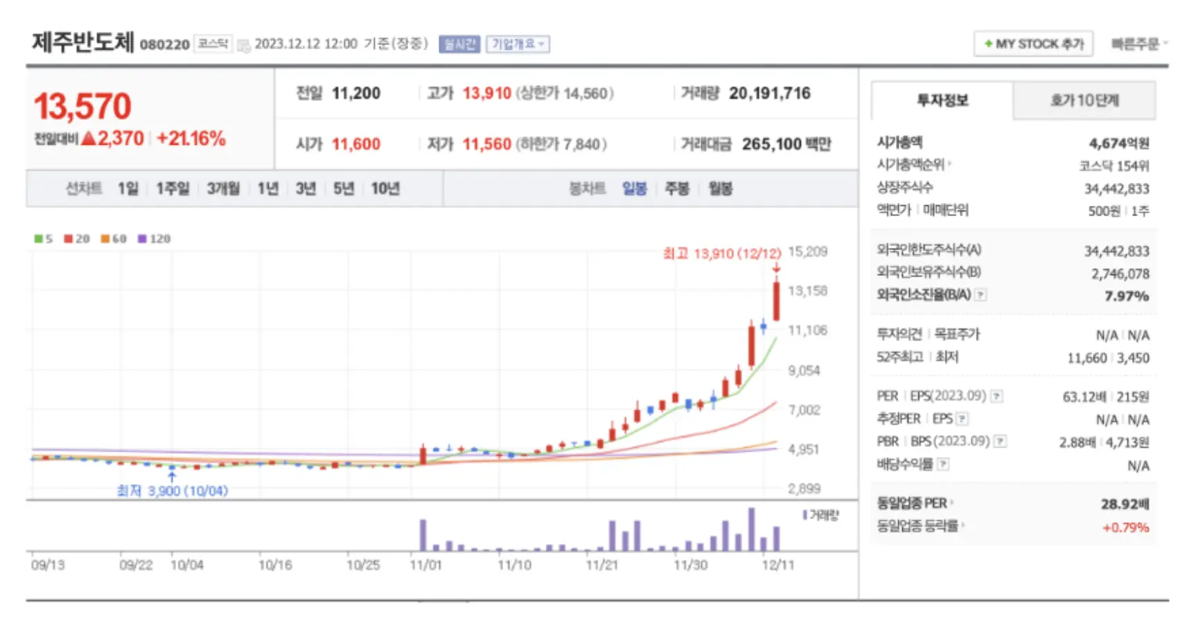 마지막으로 제주반도체입니다. 제주반도체는 최근 가파른 상승으로 연일 신고가를 기록하고 있습니다.
