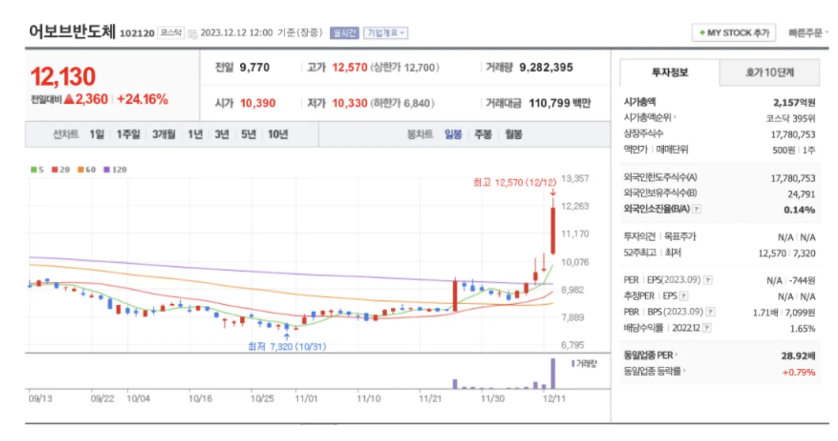 어보브반도체는 이번 네덜란드 반도체 동맹 이슈로 가장 큰 상승을 보여주었는데요. 어보브반도체는 코스닥 종목으로 시가총액은 오늘의 상승분을 반영해서 2000억 정도로 작은 규모의 회사입니다. 현재로는 대장주로 보여집니다. 어보브반도체 주가가 앞으로 더 상승할지 주목됩니다.