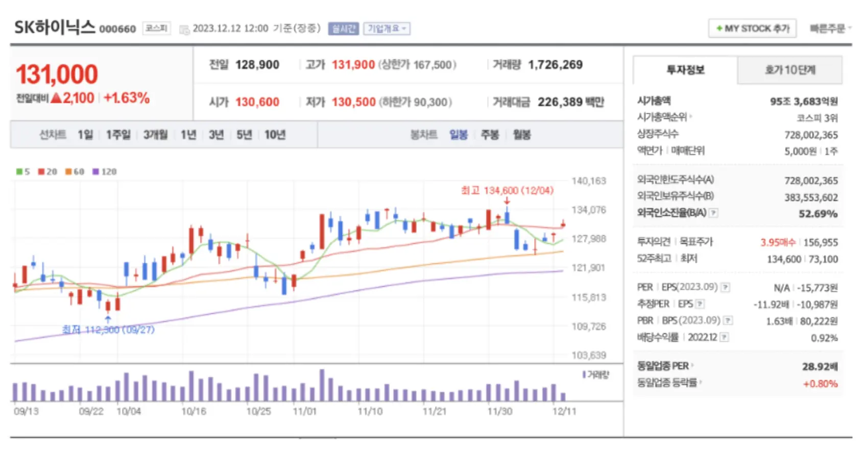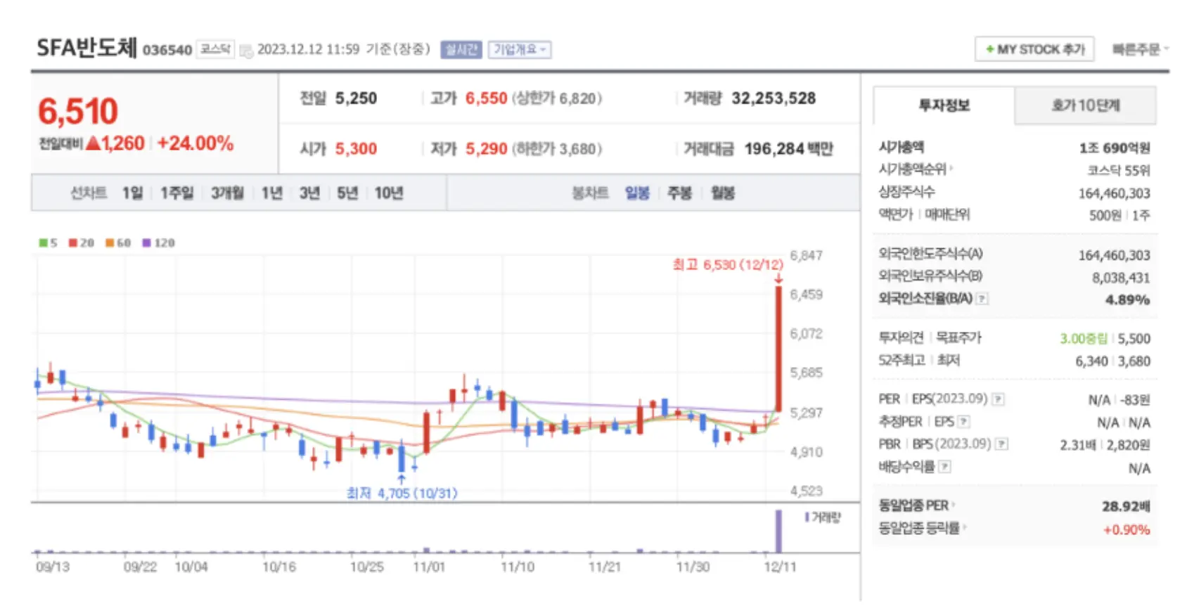 다음으로 이번 네덜란드 방문 이슈로 SFA반도체가 움직였습니다. 시가총액이 1조 정도로 무거운 종목입니다.