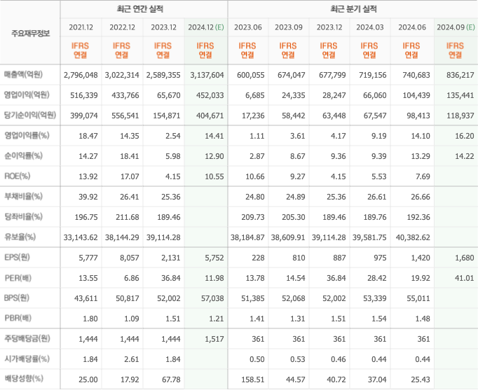 재무적인 측면에서 삼성전자의 주가 전망은 긍정적입니다. 2024년 말을 기준으로 삼성전자의 주가를 예상해보면, 약 79,852원으로 전망되며, 2025년 말에는 주가가 약 86,389원에 이를 것으로 전망됩니다.매출액(억원) 2,796,048 3,022,314 영업이익 516,339 433,766 당기순이익(억원) 399,074 556,541 부채비율(%) 39.92 26.41 유보율(%) 33,143.62 38,144.29