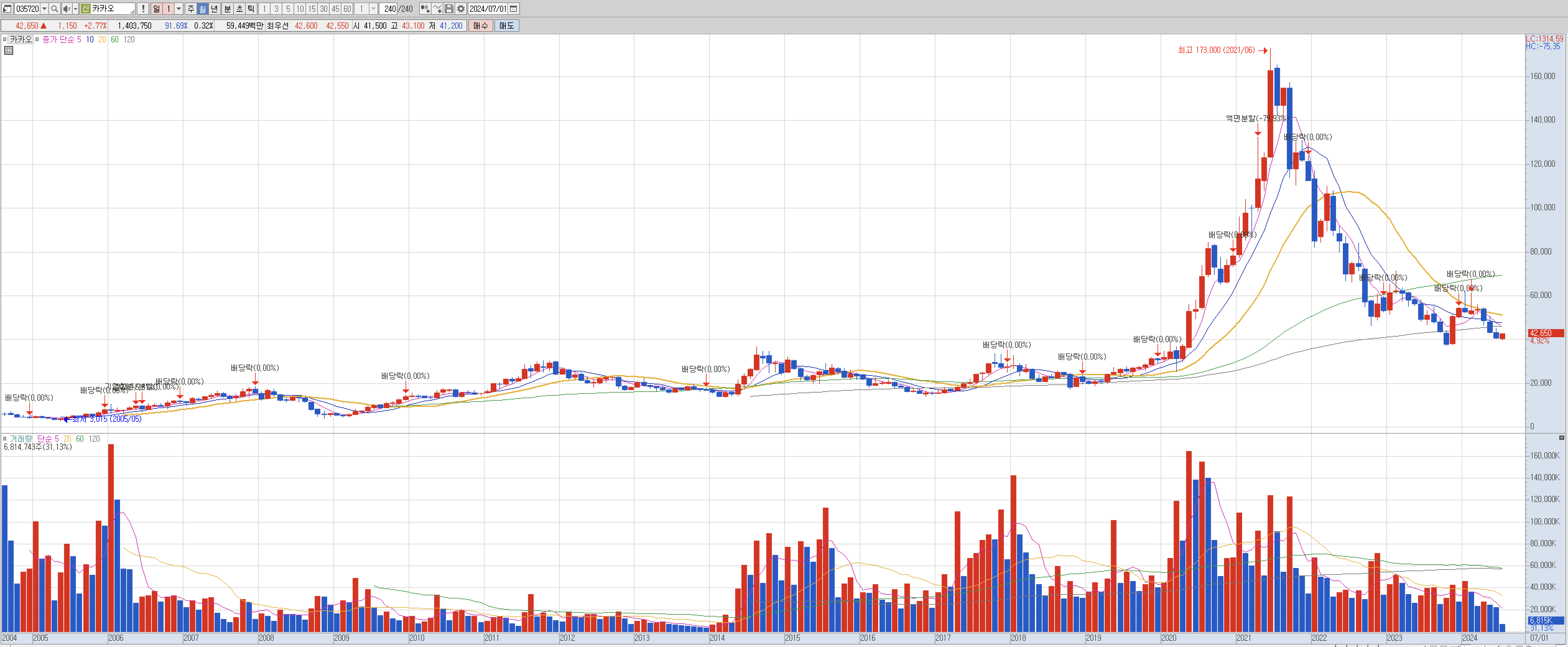 카카오는 한국의 대표적인 IT 기업으로, 카카오톡, 카카오페이, 카카오 게임 등의 사업으로 우리 생활에 깊숙이 자리 잡고 있습니다. 주가는 2021년 초반 엄청난 급등을 보여줬지만 이후 지속적인 하락을 겪으며 많은 투자자들을 힘들게 하고 있습니다.