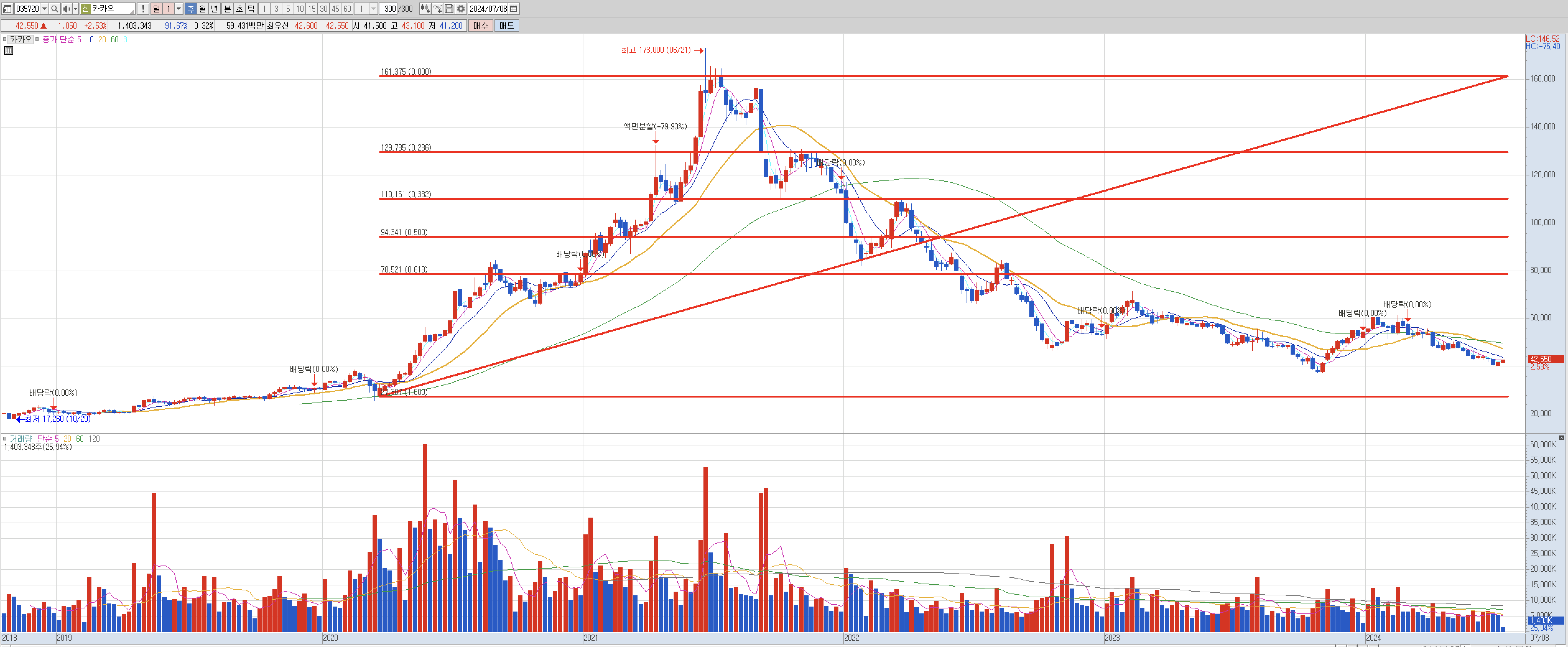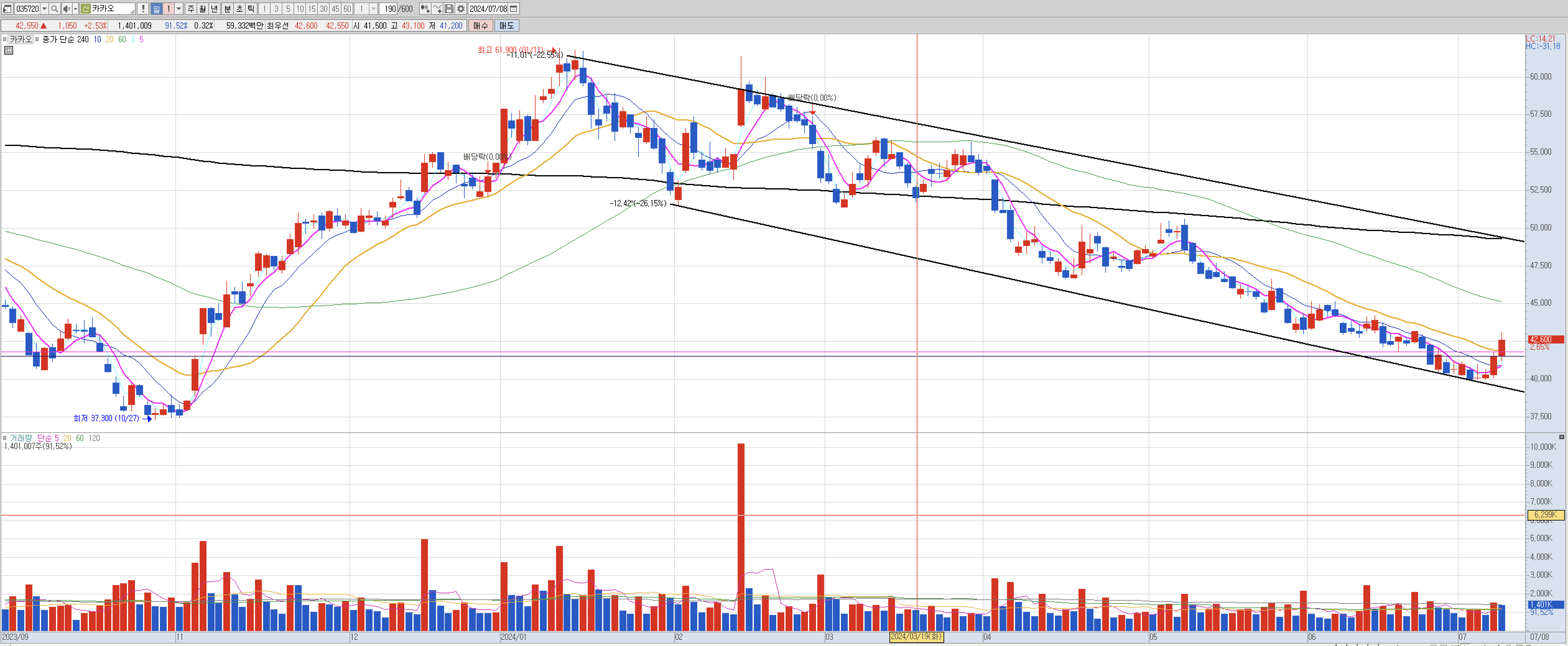 카카오 주가는 2023년 9월 바닥을 다지고 추세를 돌리는 듯 했습니다. 장기이평선 들을 뚫고 정배열로 돌려놓았지만, 현재는 안타깝게도 쌍봉을 맞고 하락 추세인 모습을 보여주고 있습니다. 주봉을 참고해 보시면 가파른 상승 후 가파른 하락을 한 것을 볼 수가 있습니다. 다만 가파른 하락이 점차 멈추고 2020년 상승 전 주가로 거의 회귀한 모습인 점은 상승할 수 있는 모멘텀은 있다고 보여집니다. 하지만 주봉으로 봤을 때도 알 수 있다시피 저점은 더 열려있는 것으로 보여집니다.