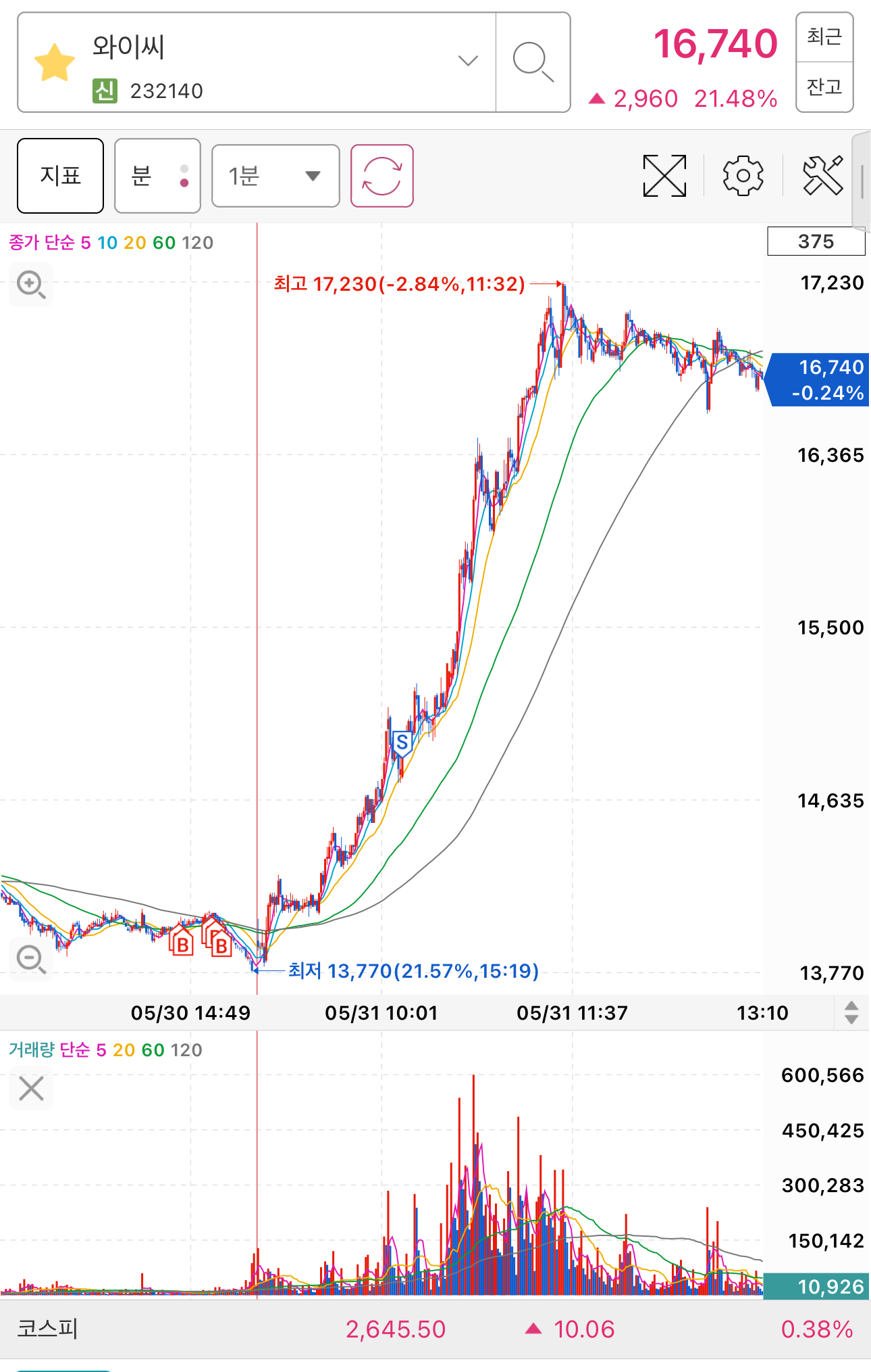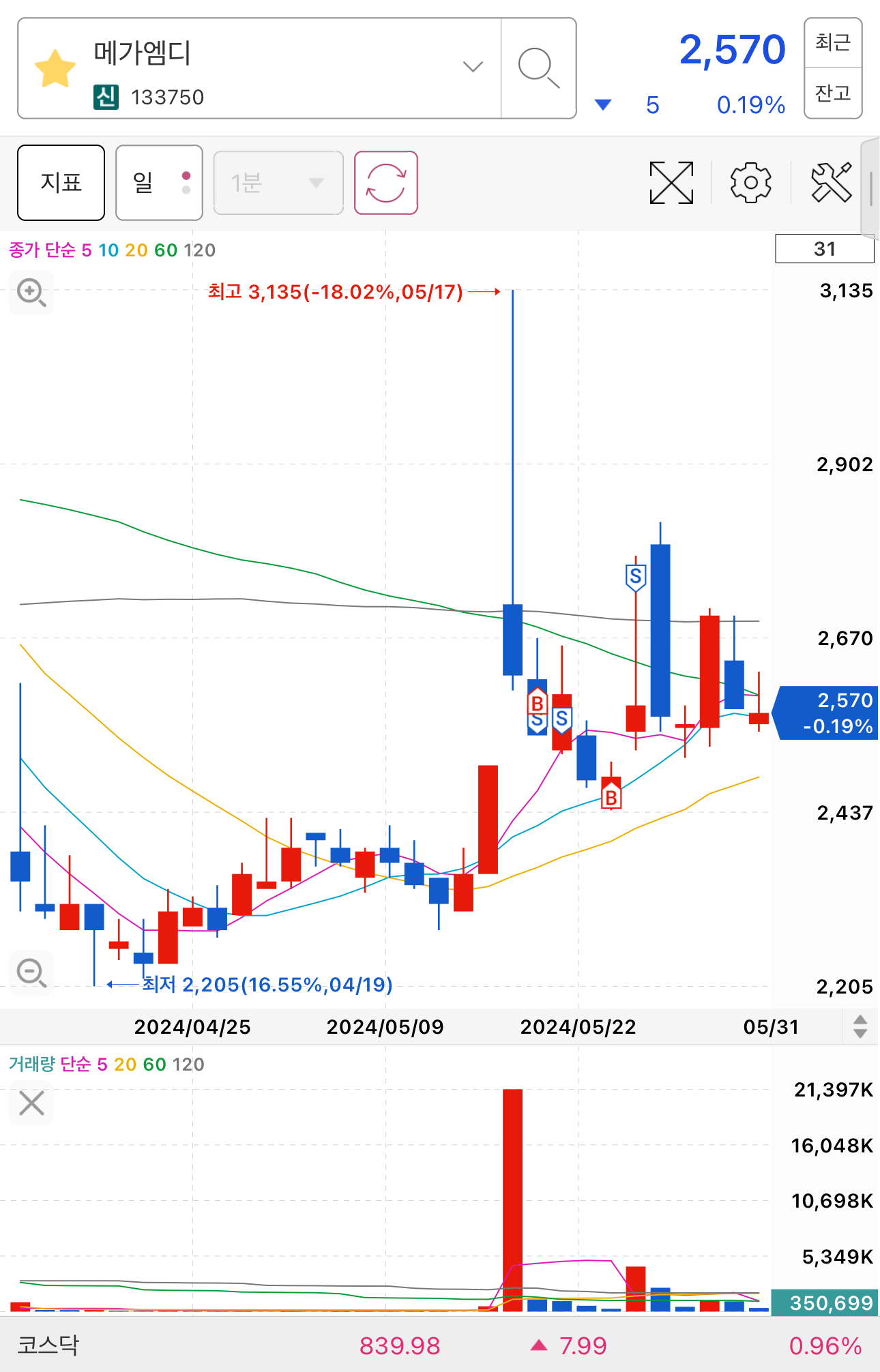 많은 투자자들에게 주목 받았던 주도주입니다. 저도 5일선 눌림매매하기도 하고 장중 단타도 했던 종목입니다.