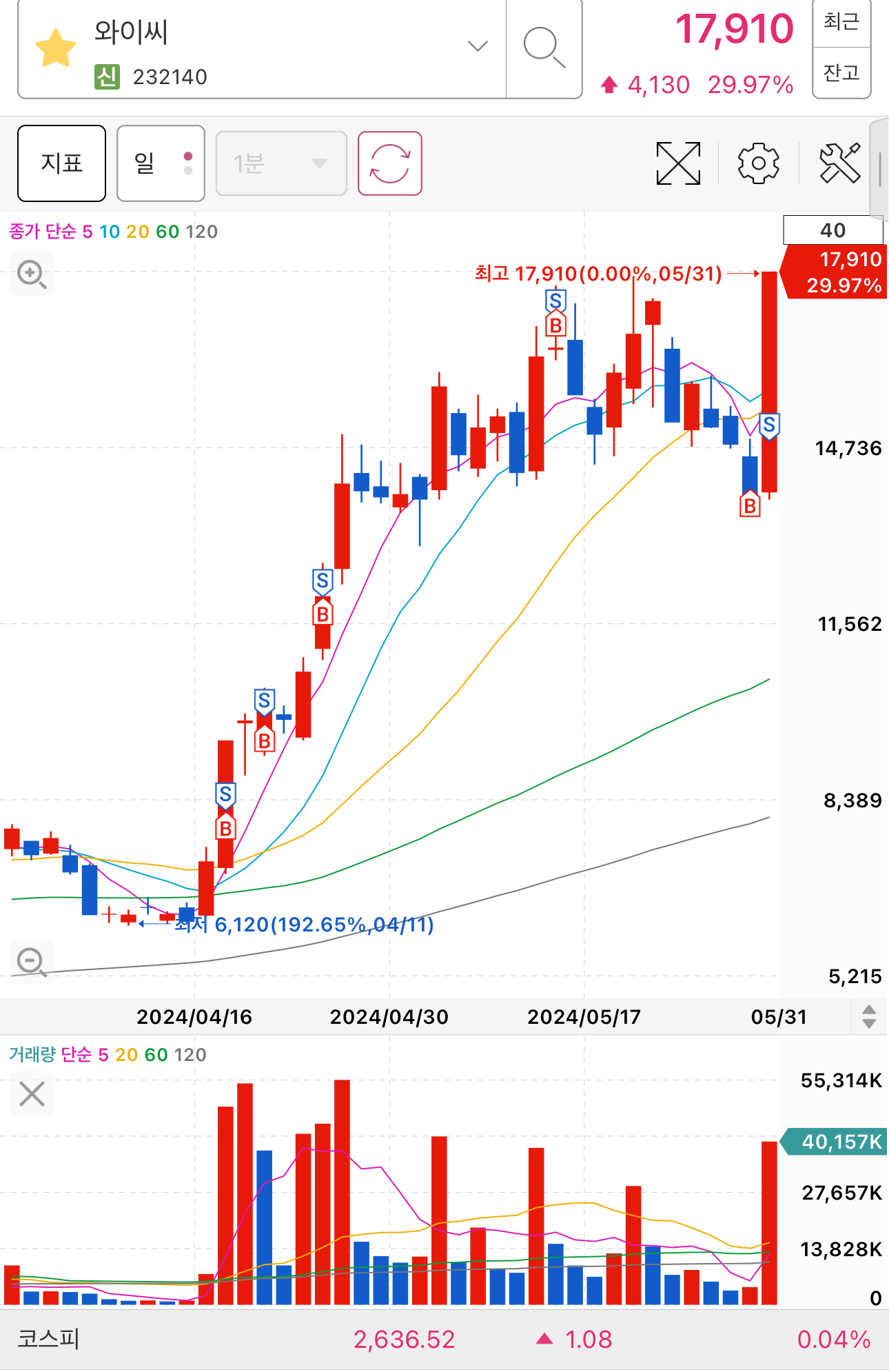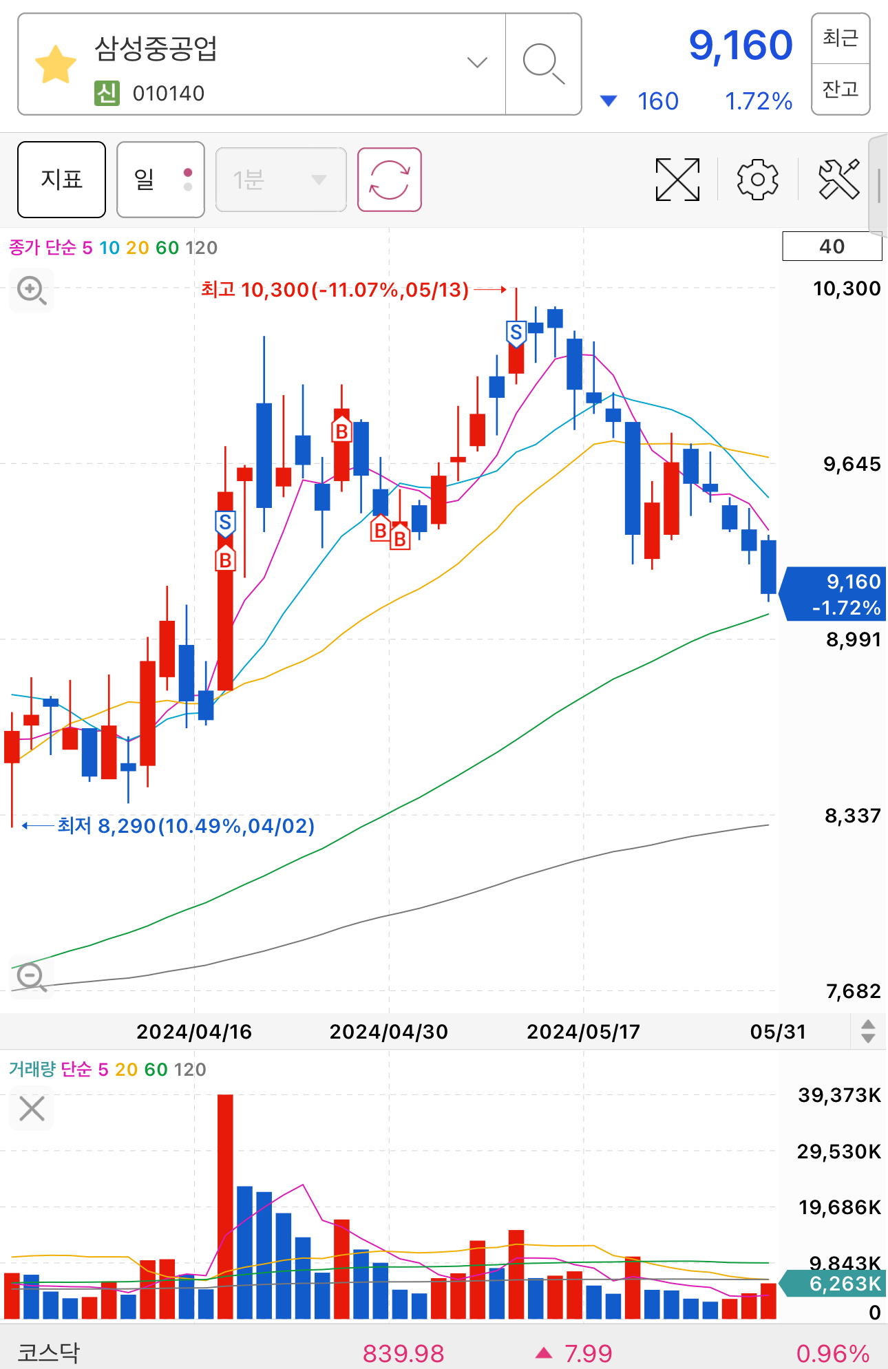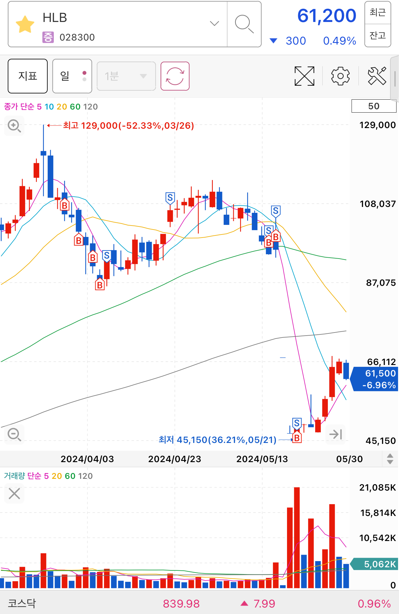 4월에 10일선 눌림부터 천천히 받아서 60일선까지 밀렸습니다.