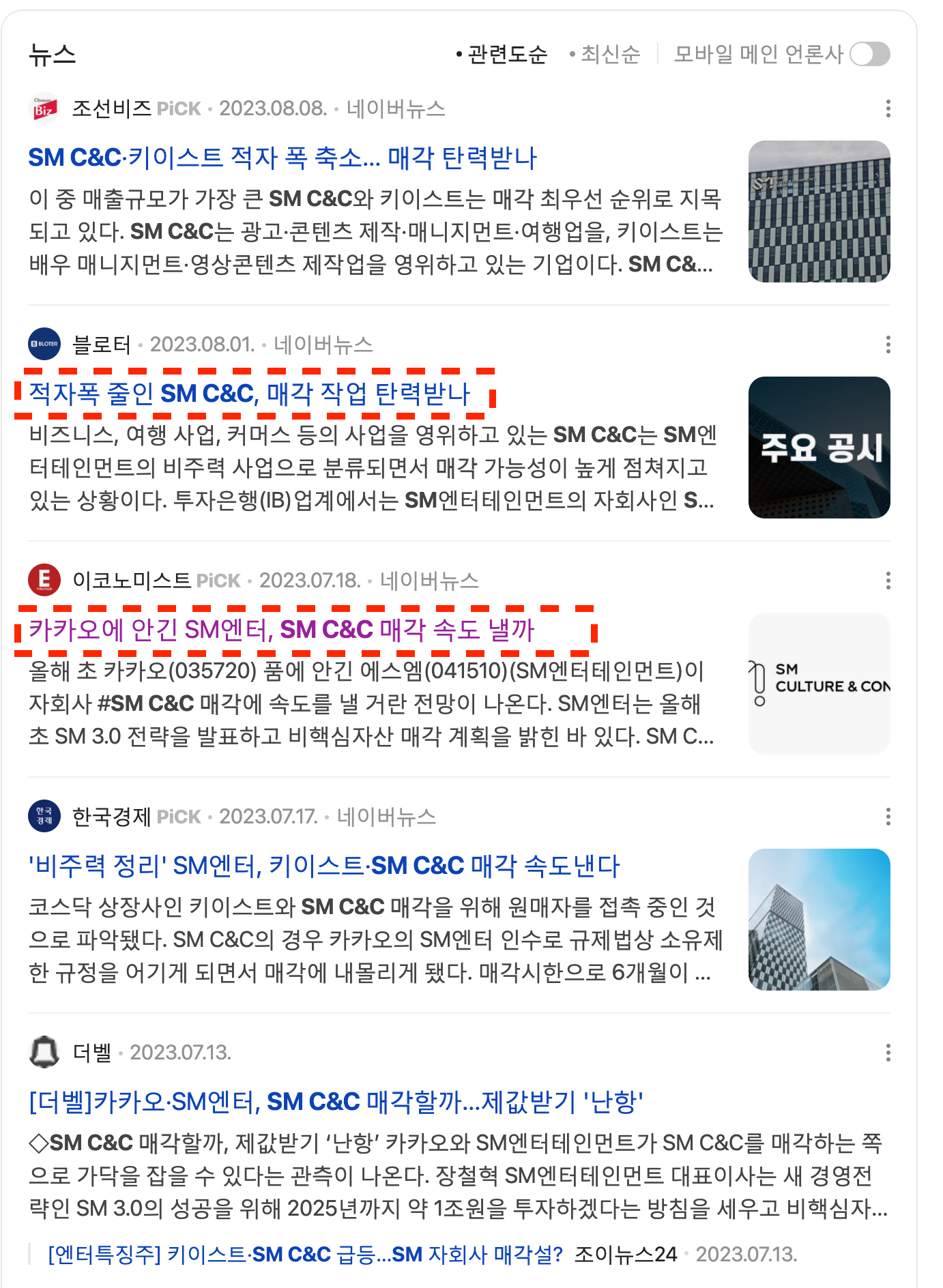 SM엔터테인먼트(에스엠)이 카카오에 인수되면서 방통위 제제에 따라 비핵심자산 매각을 필수적으로 해야하는 상황입니다. 비핵심자산 매각 대상 회사 중 가장 유력한 후보가 바로 SM C&C입니다. SM은 'SM 3.0' 계획을 발표하며 비음악부문 자회사 매각 계획을 밝힌 바 있습니다. 에스엠이 보유한 회사 중에 SM C&C와 키이스트는 매각 우선 순위로 지목되고 있으며, 두 회사 모두 광고·콘텐츠 제작 및 매니지먼트 사업을 영위하고 있습니다.
